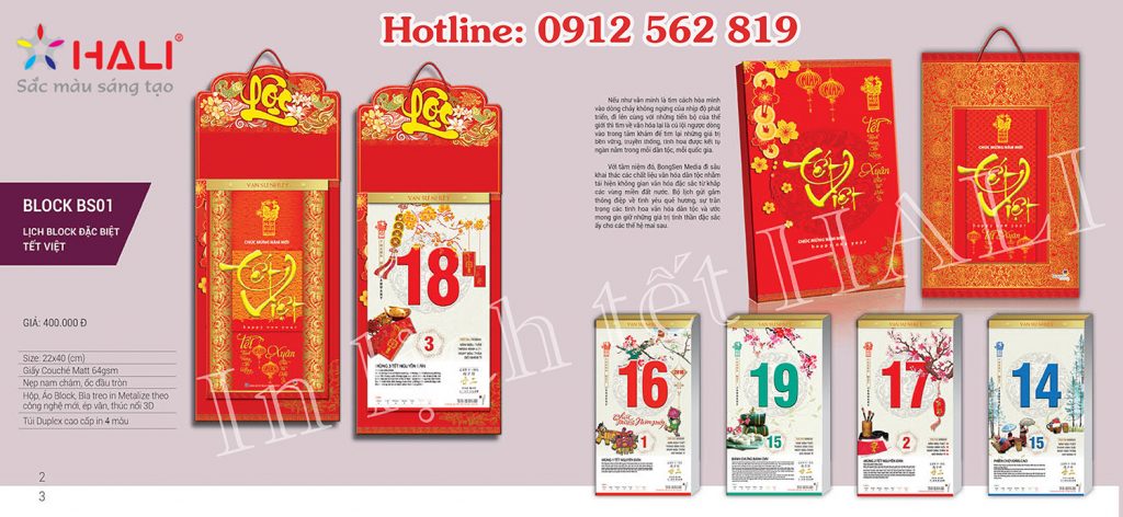 HALI là đơn vị chuyên thiết kế và sản xuất lịch tết cho các đơn vị trên địa bàn quận Long Biên và các quận trên địa bàn Hà Nội, nhận bán buôn bán lẻ lịch tết, in ấn trực tiếp lên lịch tết bằng những công nghệ in ấn hiện đại như mạ nhũ, in UV, không giới hạn sốlượng in. Ngoài ra chúng tôi còn nhận thiết kế lịch tết độc quyền cho các đơn vị, in ấn bằng công nghệ in offset, in lịch tết lấy ngay trong ngày. Còn đối với đơn vị cần  sản xuất lịch tết độc quyền với số lượng 500 cuốn trở lên, chúng tôi sẽ tư vấn khách hàng lựa chọn dịch vụ in lịch tết giá rẻ bằng máy in offset cỡ lớn, khi đó chất lượng sản phẩm cao cấp, giá thành lại rẻ hơn so rất nhiều.